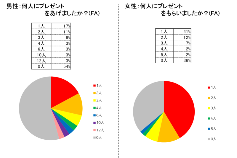 実際に、サークルアップで同日、関東の大学生を対象に調査をしてみました。「何人にプレゼントを渡したか」聞いてみると、男子の2人に1人は「0人」という結果に。