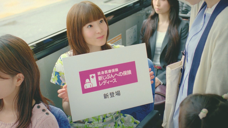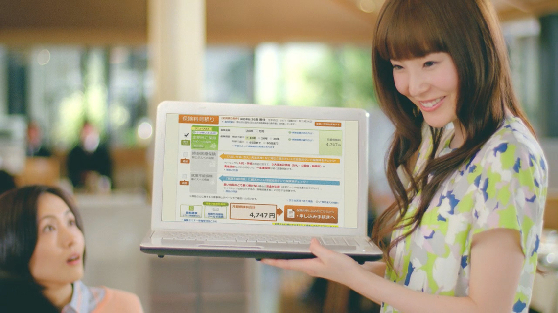 「ファミリーレストラン」編では、注文のためにチャイムを押した家族の前に突然蓮佛さんが出現。驚く家族に笑顔でパソコンの画面を示しながら、さらに安くなった保険の見積もりを勧める。「バス」編では、降車ボタンを押した主婦の隣に突如蓮佛さんが登場し女性向けの医療保険を紹介する。両編ともスマートフォンやパソコンで簡単に見積もりが取れることも訴求、蓮佛さんの爽やかな笑顔が印象的だ。