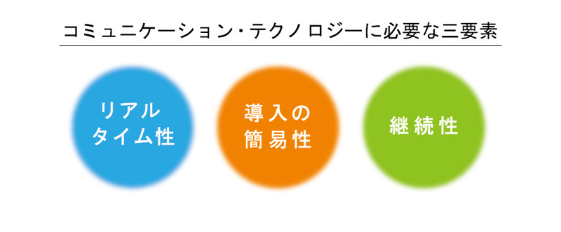 上記は、ユーザー体験(UX)にとって重要な機能を、テクノロジーで実現しているといえる。言い換えると、今後当たり前のように使われていくコミュニケーション・テクノロジーに必要なのは、「リアルタイム性」「導入の簡易性」「継続性」だろう。
