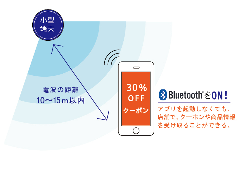 BLE施策を行うと、生活者はBluetooth機能をオンにしておけば、アプリを起動することなく、店舗に入るだけで(あるいは店舗前から)、商品情報、クーポン、タイムセール情報などを受け取ることが可能となる。