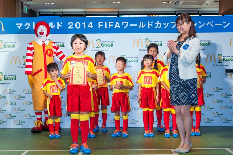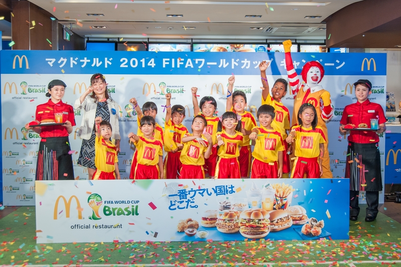 日本マクドナルドは5月25日、2014 FIFA ワールドカップ ブラジル大会に向けたキャンペーンの発表会と、大会に参加するエスコートキッズの任命式を東京・マクドナルド渋谷東映プラザ店で実施した。