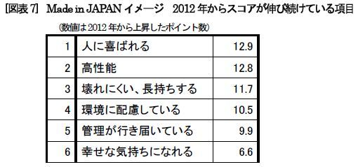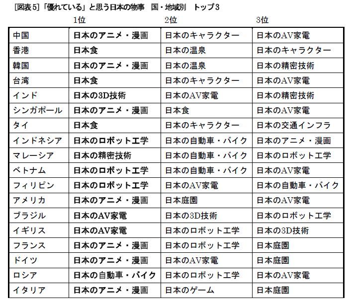 ・国・地域(および日本文化の浸透度)によって上位にくる項目は異なっている。傾向として、(日本文化が浸透しているシンガポール、タイ以外の)ASEAN諸国では日本の“技術”が、東アジア(中国、香港、韓国、台湾+シンガポール、タイ)では日本の“食、アニメ・漫画”や“温泉旅行”などに関する評価が高い傾向にある。欧米各国では全体的にはスコアが低いものの、「日本庭園」が上位にランクされる傾向があるのが特徴的。
