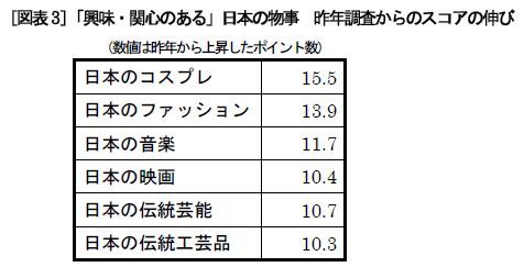 ・昨年と比較して10ポイント以上スコアが伸びた興味・関心の項目は、「日本のコスプレ」「日本のファッション」「日本の音楽」「日本の映画」「日本の伝統芸能」「日本の伝統工芸品」などで、現代文化と伝統文化という両面で、日本文化への興味・関心が高まっていると言える。