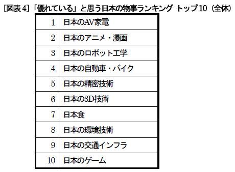 ・日本の物事の中で「優れている」と思うものを聞いたところ、全体でスコアが高かった項目の上位3つは、「日本のAV家電」「日本のアニメ・漫画」「日本のロボット工学」。