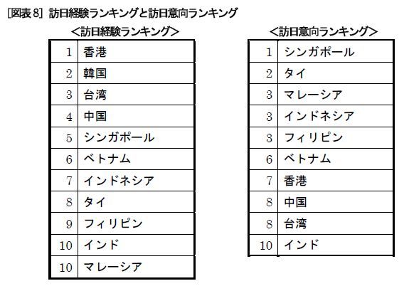・訪日経験ランキングでは、香港、韓国、台湾、中国といった東アジア諸国が上位を占めているが、訪日意向(=「1年以内に渡航する予定がある」と「日程は決まっていないが、いつか行きたいと思っている」の合計)ランキングではASEANの6カ国が上位を占めており、今後の訪日客層に変化が生じる可能性が示唆される。