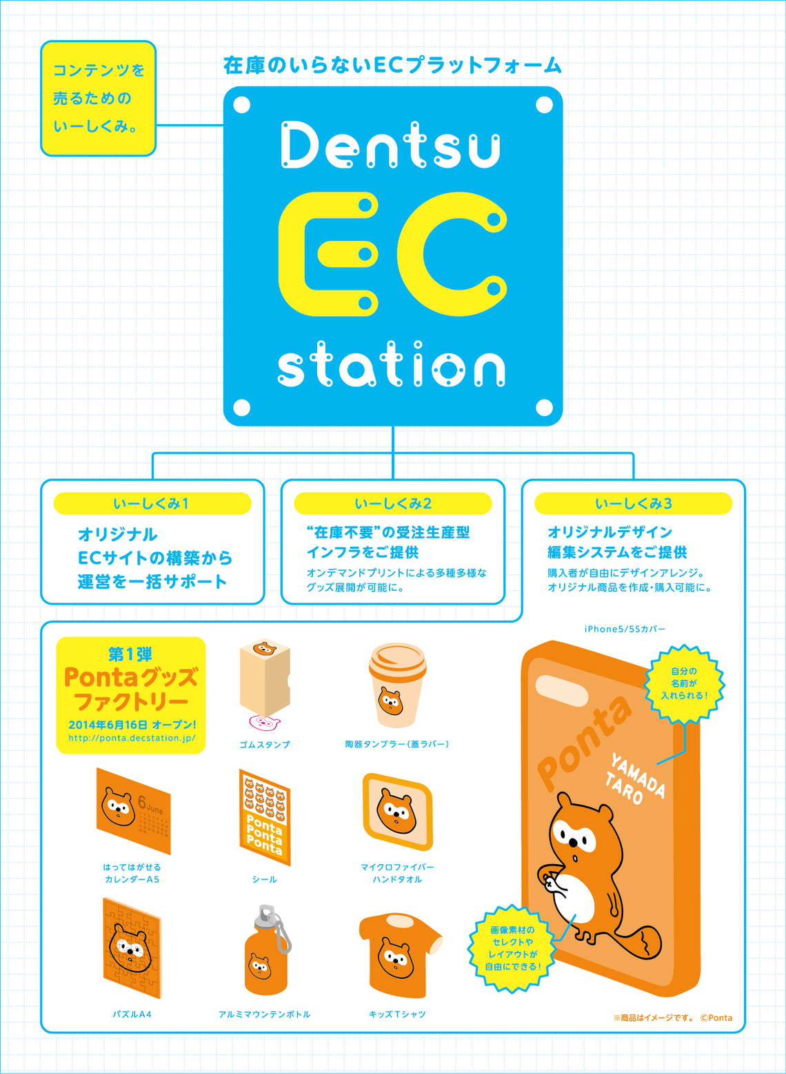 本サービスを活用した第1弾「Pontaグッズファクトリー」(http://ponta.decstation.jp/)が6月16日にオープンする。iPhoneカバーや、キッズTシャツ、ゴムスタンプなど、デザインアレンジや名前が入れられるグッズを販売する。