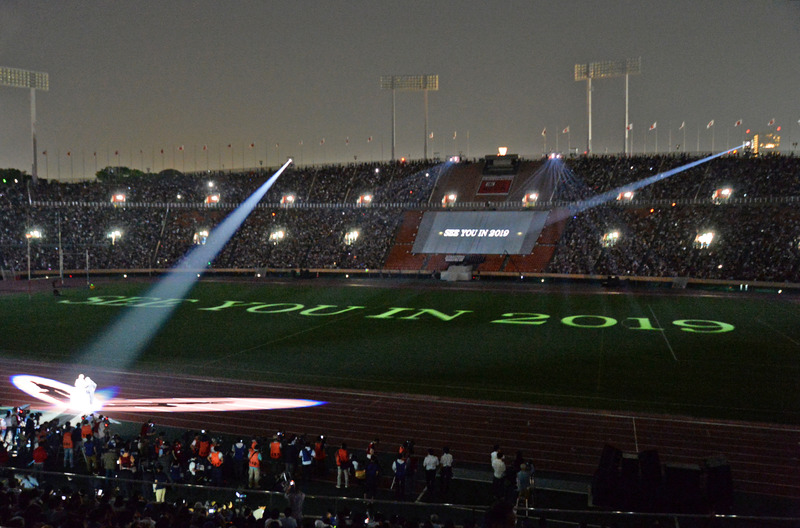 「今日、国立競技場は、その幕を閉じる。すべてのアスリートと、すべてのアスリートが生み出した奇跡に、感謝をこめて。THANK YOU.」のメッセージがスクリーンに映し出されると、聖火が消灯。しばらくの沈黙の後、「この歴史は、終わらない。5年後。新しい舞台から、新しい挑戦 が始まる」と、未来へのエールが送られ、「SEE YOU IN 2019」の文字がスクリーンとピッチ上に大きく浮かび上がった。国立競技場が残した歴史への感謝と敬意、そして、新たな歴史の始まりに夢と希望を乗せ て、花火が盛大に打ち上げられ、終演した。
