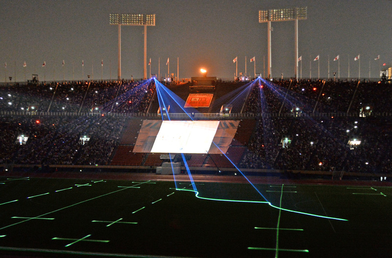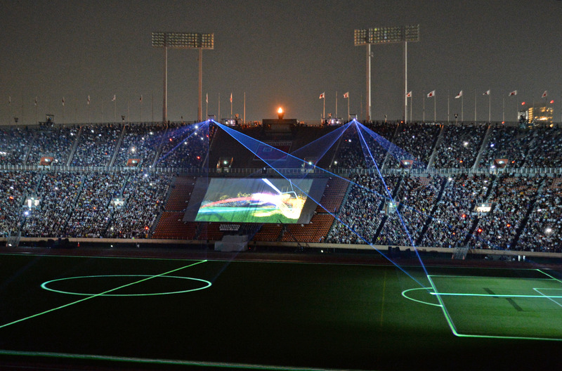陸上競技、サッカー、ラグビーなど、今も多くの人の記憶に残る偉大な記録や名勝負を映像で振り返りながら、「8798の勝者が生まれ、8798の敗者が生 まれた。挑戦する者だけが、ここにいることを許された」と、アスリートたちの勇気を讃えた。1991年世界陸上競技選手権大会でカール・ルイス選手が打ち 出した男子100メートルの世界記録、同大会で優勝したセルゲイ・ブブカ選手の棒高跳び、85年のFIFAワールドカップメキシコ大会最終予選韓国戦で ゴール40メートル手前から木村和司選手が放った伝説のフリーキックなど、選手の動きやボールの軌跡をレーザー光線で実際のフィールド上に照射し、名シー ンを光で再現するライブパーフォーマンスも行われた。