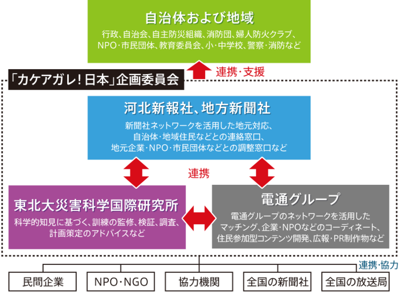 訓練の実施に当たっては、河北新報社(地域対応)、東北大災害科学国際研究所(科学的根拠)、電通グループ(企画、企業マッチング)の3者で構成する「カケアガレ!日本」企画委員会を中心に、自治体や地域、企業やNPO・NGO、全国のメディアが連携(下図参照)。産官学それぞれの知見やノウハウを活用し、役割を果たしながら活動を展開している。
