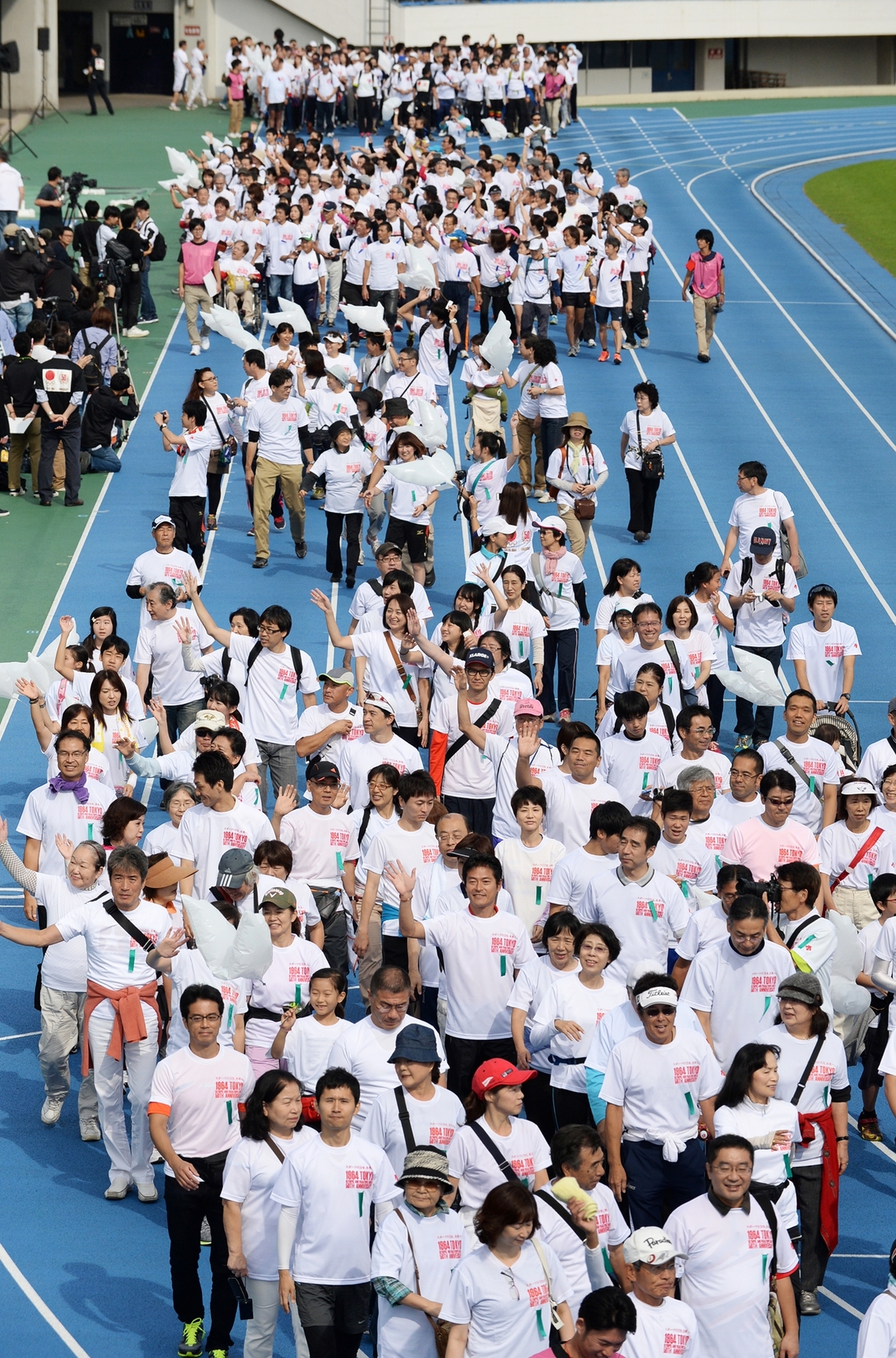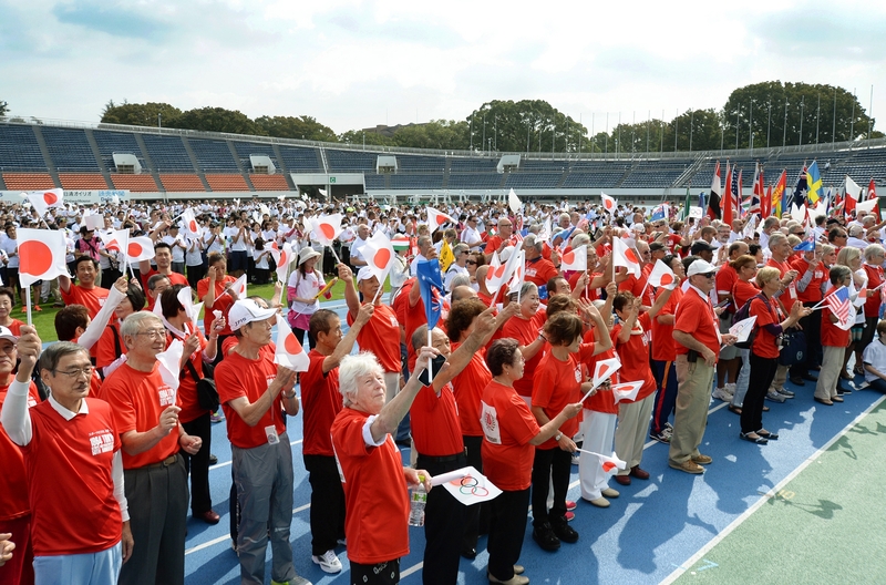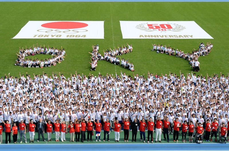 JOCの竹田恆和会長は「皆さんの行進を見て、当時の様子が鮮明によみがえった。これからもスポーツの素晴らしさを多くの人に伝え、2020年大会の成功に向けて尽力したい」とあいさつ。式後のメモリアルランでは、参加者がアスリートたちと競技場の周囲をジョギングした後、人文字を作り、笑顔で記念写真に納まった。