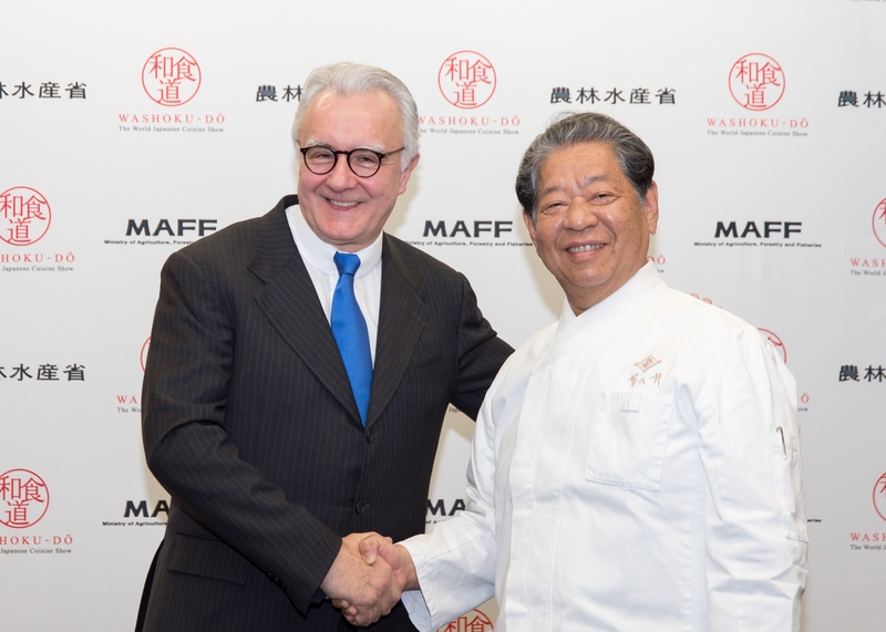 12月4日、都内で同イベントの記者会見が行われ、イベントの総合プロデューサーを務める、料亭「菊乃井」主人・村田吉弘氏やアンバサダーのフランス料理シェフ・アラン・デュカス氏らが出席した。冒頭、農林水産省 食料産業局の大坪正人食品小売サービス課長は「海外で和食の魅力を伝える人材を育てる場になることを期待する。イベントの主な対象は、外国の方を想定しているが、国内の皆さまにも和食の新しい一面に触れてもらいたい」とあいさつした。村田氏は「官・民・料理人が一体となって、食のイベントができるのは素晴らしい。他の自治体も巻き込んで、さらに和食が世界に波及していくことを願っている」と話した。デュカス氏は「和食は文化遺産になったが、今後、他の料理と戦っていくためにはマーケティングや情報提供も必要だ」と述べた。2人はトークセッションで、和食の特長である食材の多様性や、ヘルシーさ 栄養バランス、季節性 日本酒との相性などについて語り、イベントへの期待感を示した。