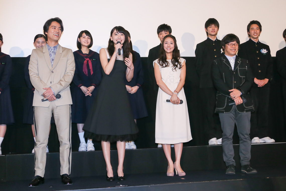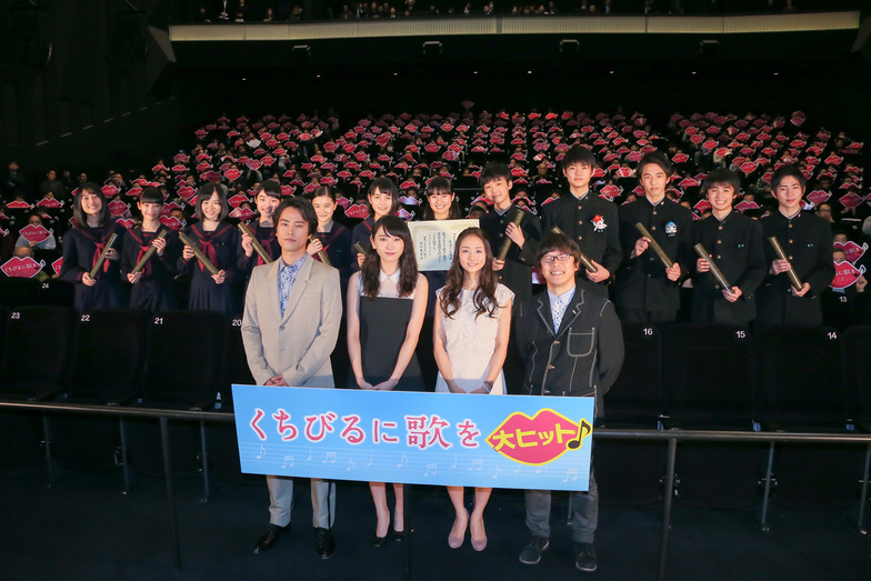 2月28日、映画「くちびるに歌を」が公開初日を迎え、東京・新宿ピカデリーで舞台あいさつが行われた。臨時教員のピアニストを演じる主演の新垣結衣さん、教師役の木村文乃さん、桐谷健太さんら主要キャストのほか三木孝浩監督が出席。さらに合唱部員役の12人も登場し、主題歌である「手紙~拝啓 十五の君へ~」(作詞・作曲:アンジェラ・アキさん)の合唱を披露した。