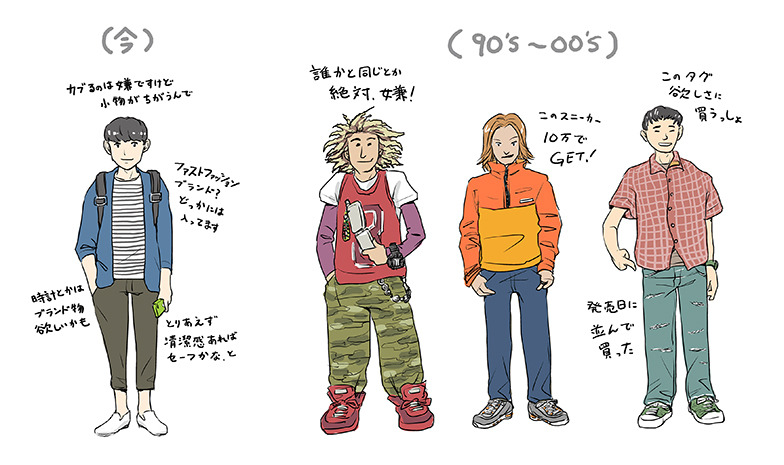 NGコーデ回避術を身に付け「ダサい」も減った分、その分「驚き」も減りました。90年代後半~00年代前半のストリートファッション全盛期と比較すると、均質化、ともいえる現象が起きているのは事実です。お金のかけなさ、好きという気持ちの希薄化、誰でもどこでも同じものを手に入れられる購買環境の変化、とともに「驚き」の連鎖という“うねり”の少なさも相まって、ファッション熱の低下と評されているのではないでしょうか。