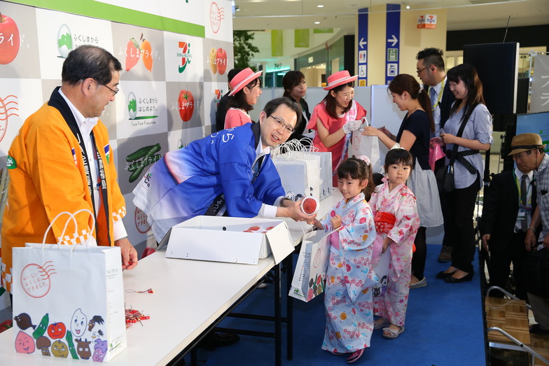 8月4日、東京・江東区のイトーヨーカドー アリオ北砂では「福島県産夏秋青果物PRイベント」が行われた。イトーヨーカドーをはじめとしたセブン&アイグループは、東北被災県の行政と連携し、店頭販売キャンペーンやイベントを実施することで被災地域の復興を支援する「東北かけはしプロジェクト」を展開している。