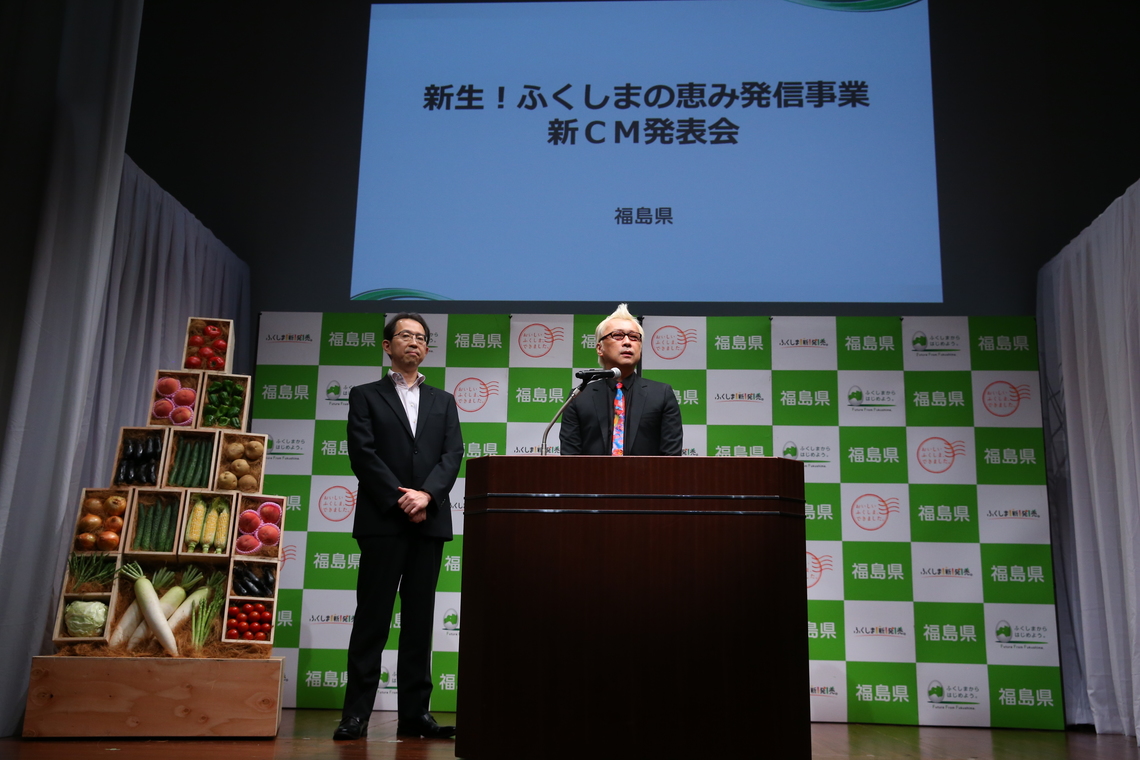 CM放送開始日に東京・中央区の時事通信ホールで行われた発表会で、内堀雅雄知事は「CMで生産者のプライドを取り戻したい。福島が第二の故郷と応援してくれるTOKIOに出演してもらい、ディレクターは、郡山市出身の箭内道彦さんだ。多くの人に県の野菜や果物を食べてもらい、笑顔になってほしい」とあいさつした。