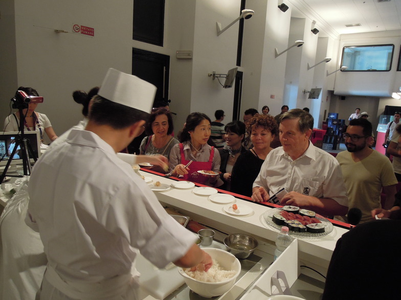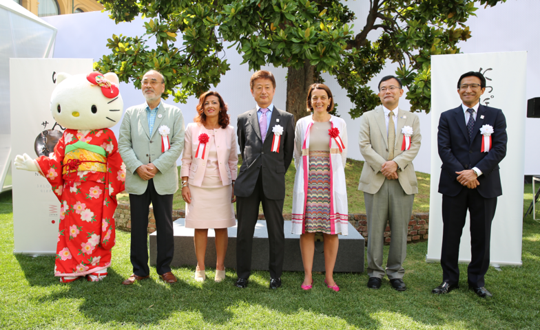 初日の6月25日には、長谷部正道農水省大臣官房審議官、福井昌平ミラノ万博日本館総合プロデューサー、加藤辰也ミラノ万博日本政府代表、天羽隆農林水産省政策課長、Chiara Biscontiミラノ市評議員、PierCarla Delpianoステッリーネ財団理事長、さらに日本館特別大使のハローキティも参加し、華やかにオープニングを飾りました。