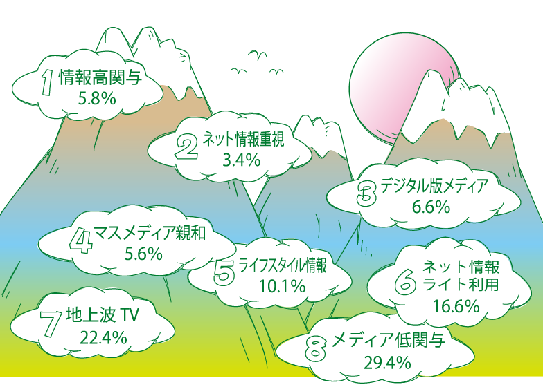 渡辺:今回の調査では、「頼りにしている情報源」を調べただけでなく、前述の13種類のメディアを利用するパターンの特徴から、似た人たちをグループ化しました。①情報高関与(約5.8%)②ネット情報重視(約3.4%)③デジタル版メディア(約6.6%)④マスメディア親和(約5.6%)⑤ライフスタイル情報(約10.1%)⑥ネット情報ライト利用(約16.6%)⑦地上波テレビ(約22.4%)⑧メディア低関与(約29.4%)という八つです。