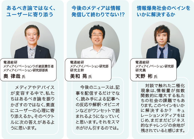 座談会でも触れているが、ポイントは変化の過程にあること。まず現状をしっかりと認識し、その上でプランニングし、常にチェックを繰り返し、既成の経験や観念にとらわれないことが肝心だろう。こうした状況が生まれたのは、24時間365日インターネットにつながり続け、いつでもどこでも持ち歩けるスマホでニュースに触れるようになったため。スマホの動向を抜きにしたメディア論は、今後成り立たないのかもしれない。