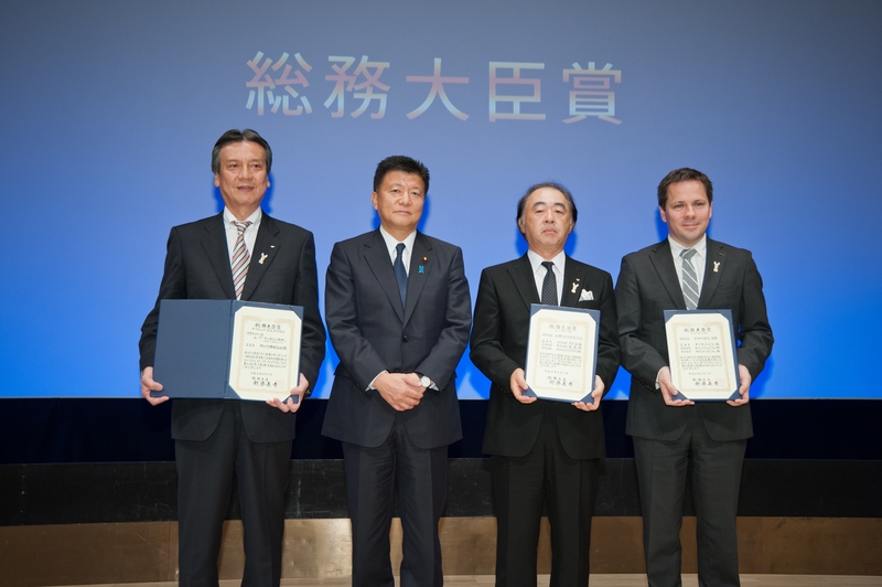 グランプリ作品には、新藤義孝総務相から総務大臣賞が贈賞され、ダイハツ工業の三井正則社長、ワコールの安原弘展社長、ナイキジャパンのカール・グリバートGM/プレジデントが受賞の喜びを語った。(写真は左から、ダイハツ工業の三井社長、新藤総務大臣、ワコールの安原社長、ナイキジャパンのグリバートGM/プレジデント)