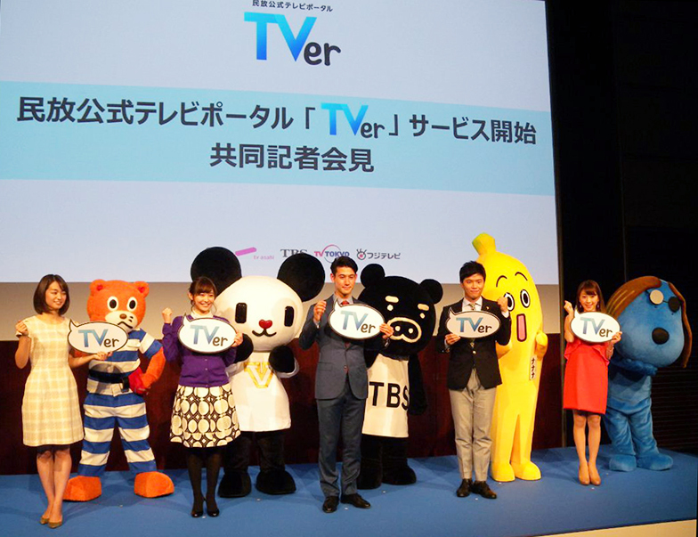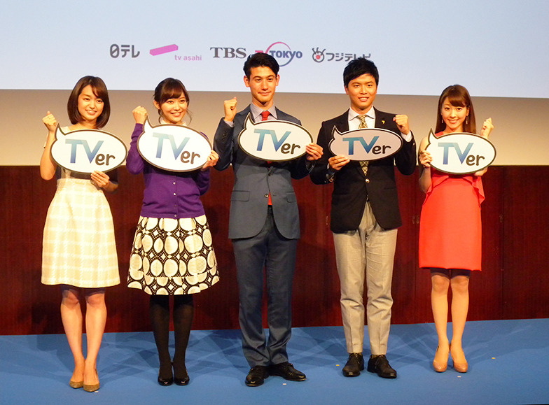 サービス開始当日に、東京・港区の日本テレビで開かれた共同記者会見では、5社を代表してTBSテレビの河合俊明常務が「TVerは民放公式です。ここにあるコンテンツはCMも含めて全て安心・安全、無料で高画質。ぜひ今日からTVerを楽しんでください」とあいさつ。続いて、民放5社の若手アナウンサーが登壇し、それぞれイチオシの番組を紹介しながら「万が一、見逃したときはTVerで」「(リアルで見て)もう一度見たいときもTVerで」などと新サービスをアピールした。