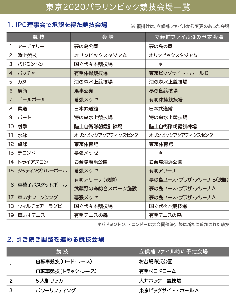 2013年に国際オリンピック委員会に提出した「立候補ファイル」から変更があったのは6競技の会場。大会開催決定後に追加された競技のバドミントンは国立代々木競技場に、テコンドーは幕張メッセでの実施が決まった。