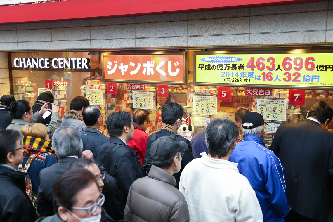 高額当せんの多さで人気の同売り場には徹夜組を含む約1400人が列をつくり、午前8時30分に窓口が開くと夢を乗せて宝くじを買い求めた。