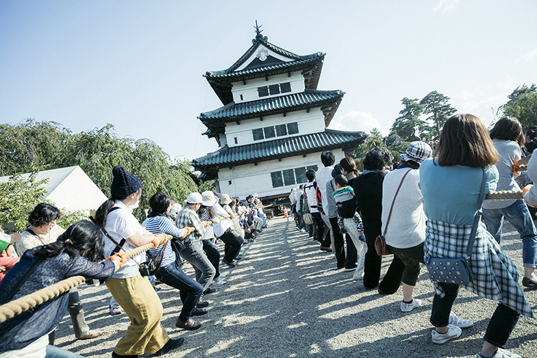 そして迎えたのが、9月20日から27日にかけて弘前城本丸で開催された曳屋体験イベント曳屋ウィーク。天守の台座から延びる4本の綱を約100人で引っ張り、天守を人力で動かす。綱は市内の中学校から運動会の綱引き用の綱を借りた。こうしたところにも、市を挙げての協力がうかがえる。