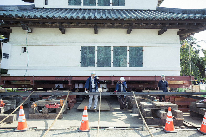 そこで選ばれたのが、天守を石垣と切り離し、下から持ち上げる工法だ。そして天守の下にレールを敷き移動させる、曳屋(ひきや)と呼ばれる方法。石垣と切り離す地切りは8月16日に行われた。