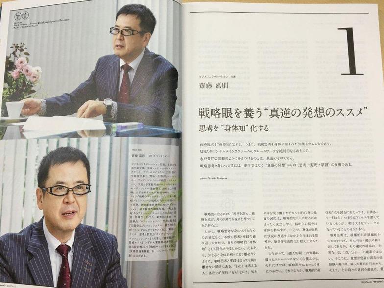 ここで書いた拙稿のタイトルは「コンセプトづくりの身体的思考 SECIモデルとぐるぐる思考で『今のアイデア』をつくる」というものでした。そして「思考力の原点に戻る」という特集のオープニングを飾っていたのが齋藤嘉則さんの「戦略眼を養う“真逆の発想のススメ” 思考を“身体知”化する」でした。