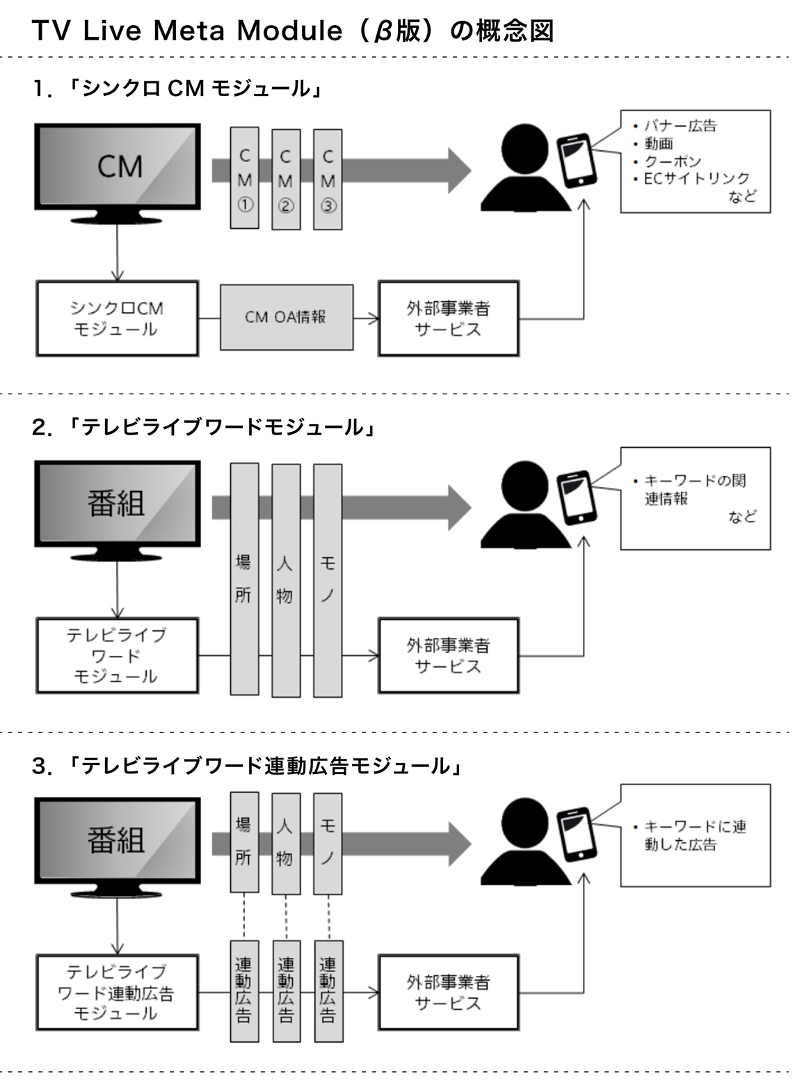 電通は、2013年9月から、放送と連動したセカンドスクリーンの活用について研究する「セカンドスクリーンプロジェクト」を推進しており、TV Live Meta Module(β版)はその成果の一つ。テレビ番組の内容を字幕情報から取得して特定キーワードを抽出したり、地上波テレビで流れるCM画像から広告主や商材を特定したりする運用を高速で自動化、それらの情報を外部のサービスとつなげる仕組みを構築した。番組で取り上げられた情報の取得・運用が自動化されていることから、外部事業者は既存のサービスに付加価値を加えるコンテンツを提供したり、新たなマネタイズにつながるサービスを開発したりすることが可能になる。