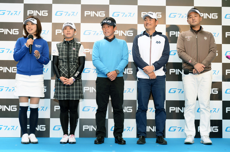 続いて、イベントに参加するPING契約プロの堀尾研仁、中井学、小野寺誠、上野藍子、勝又優美の5人のプロが紹介され「素晴らしい練習場に負けないようにレッスンをしたい」「ジュニアや女性にも楽しんでほしい」「PINGの最新モデルの打ち放題を体感してほしい」など抱負を述べた。