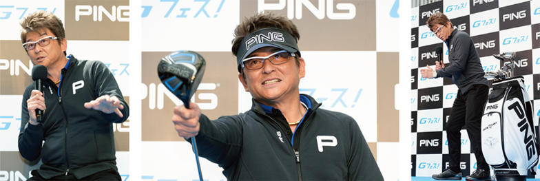 哀川さんは大のゴルフ好きとして知られ、毎朝ゴルフクラブの素振りを300回こなし、ベストスコアは79。PINGアパレルでキメた哀川さんは「素材感がアウトドア派に魅力的だ。今年のウエアは黒でいく」とお気に入りの様子で、Gスタジアムについては「家に欲しい!」と笑わせた。最新のGシリーズを使った感想は「ボールが“つかまる”感覚で安心感がある」と高評価。今年もすでに17、8ラウンド回ったという哀川さんは「芝居もゴルフも小手先ではだめ」など極意を披露。Gシリーズのキャディーバッグとフルセットをプレゼントされると、Gシリーズの特長やゴルフ上達のコツなどを、手ぶり身ぶりを交えて熱く語り“アニキ”っぷりを見せた。