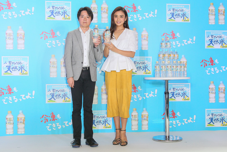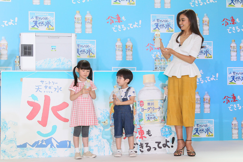 ニュース公開日: 2016/07/060猛暑を乗り切れ!サントリー天然水が冷凍兼用ボトルを採用#メディア/コンテンツ#イベント#発表会前の記事次の記事 サントリー食品インターナショナルは7月4日、「サントリー天然水」の新しい楽しみ方を広めるため、東京・港区の東京ミッドタウンで「サントリー天然水『夏は氷らせよう!』」PRイベントを開催した。 猛暑が予想される今夏、「冷凍してアウトドアに持ち出したい」というニーズが増えたことを受け、新たに独自の冷凍兼用ボトルを採用した同製品は、そのまま冷凍しても安定した品質を保てることが特長。自宅で凍らせることはもちろん、スーパーなどの店舗で冷凍された製品を購入することも可能となった。 イベントの冒頭、食品事業本部ブランド開発第1事業部の鵜飼太祐部長が登壇し、「発売以来、お客さまから『冷凍して持って出歩きたい』というご要望を頂いていた。そのご要望に応え、当社オリジナルのボトルを開発し発売した」とあいさつした。 ステージにはサントリー天然水ブランドアンバサダーを務める滝沢眞規子さんが登場し、2人の子役と一緒にシャーベット状に凍らせた「サントリー ヨーグリーナ&南アルプスの天然水」を試飲した。家庭でも飲む機会が多いという滝沢さんは「冷たくてのどごしがいいです」と、夏にピッタリの新しい味わいに満足げな表情を見せた。 続いて登場したのは、「冷凍兼用ボトル専用 サントリー天然水 凍らせボトルフリーザー」から取り出された同製品。一度空気に触れさせた後キャップを閉めてシェークすると手品のように凍り始める不思議な光景に、滝沢さんと子役の2人は大興奮で「ふわふわしておいしい」と口をそろえた。 さらに滝沢さんはシャーベット状の「サントリー ヨーグリーナ&南アルプスの天然水」に冷凍ブルーベリーを加えるオリジナルのアレンジレシピを披露し、「今年の夏は猛暑が予想されているので、ぜひ試してくださいとコメントした。 関連リンクhttp://www.suntory.co.jp/water/tennensui/kooraseyou-cp/index.html