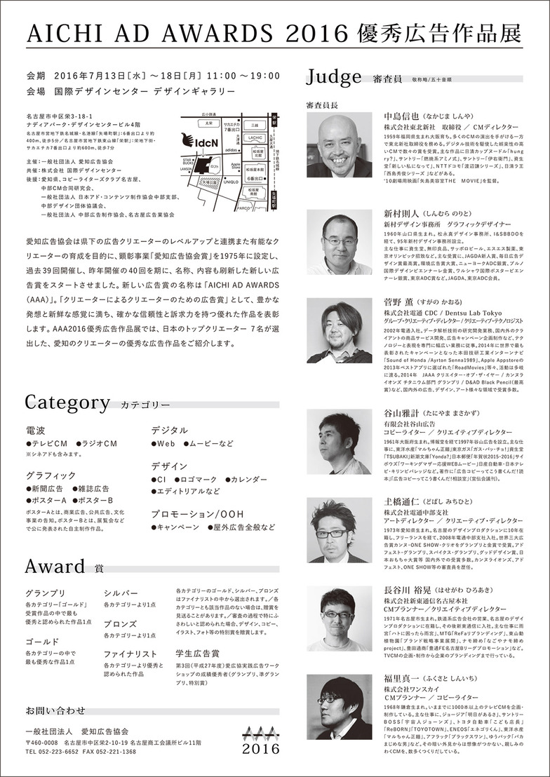 同協会は、県内の広告クリエーターのレベルアップと連携、育成を目的に「愛知広告協会賞」を過去39回にわたり主催してきた。2015年に40回を迎えるのを機に内容も刷新し、“クリエーターによるクリエーターのための広告賞”として「AICHI AD AWARDS(AAA)」をスタートさせた。