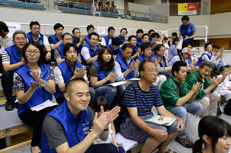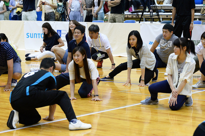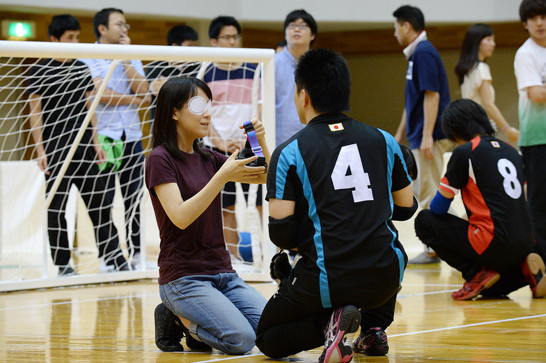 会場では試合の間を利用して、ゴールボールの体験会が開かれ、多くの観客が参加した。