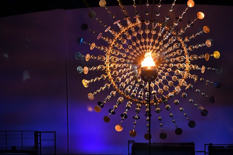 点火された聖火は上方へとつり上げられ、太陽をイメージしたオブジェの前に設置された。最後は多数の花火が打ち上げられ、スタジアム全体がさまざまな色彩に包まれて華やかなフィナーレを迎えた。