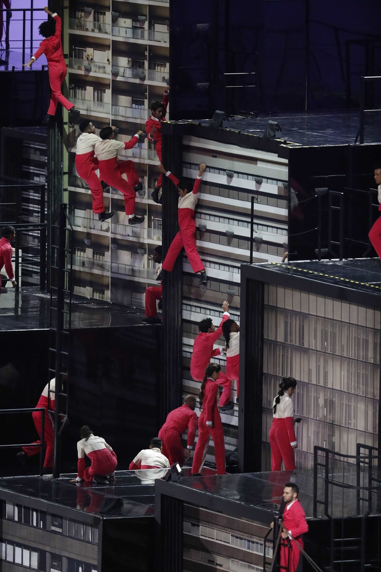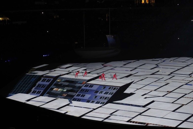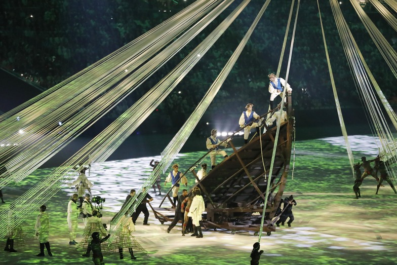 総合演出を手掛けたのは、ブラジルを代表する映画監督のフェルナンド・メイレレス氏。大規模なプロジェクションマッピングを使い、ブラジルの大地に生命が誕生した様子から、アマゾンの熱帯雨林、ヨーロッパ文化の流入、奴隷制の歴史、都市の興隆など、さまざまな人種と文化の衝突と融合を見せることで、多民族国家ブラジルを表現した。