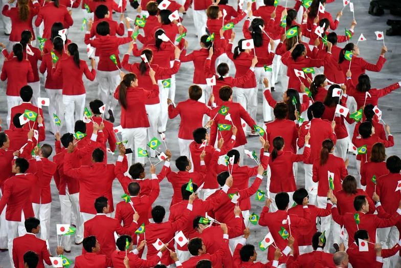 選手の入場行進はサンバを基調とした音楽をバックに行われ、日本は104番目に登場。旗手の右代啓祐選手(陸上十種競技)を先頭に選手団が姿を現すと、ひときわ大きな歓声が起こった。日本選手は日の丸とブラジル国旗の小旗を振り、両国の絆をアピールした。そして、今回初めて結成された難民選手団が入場すると、会場はスタンディングオベーションで迎えた。