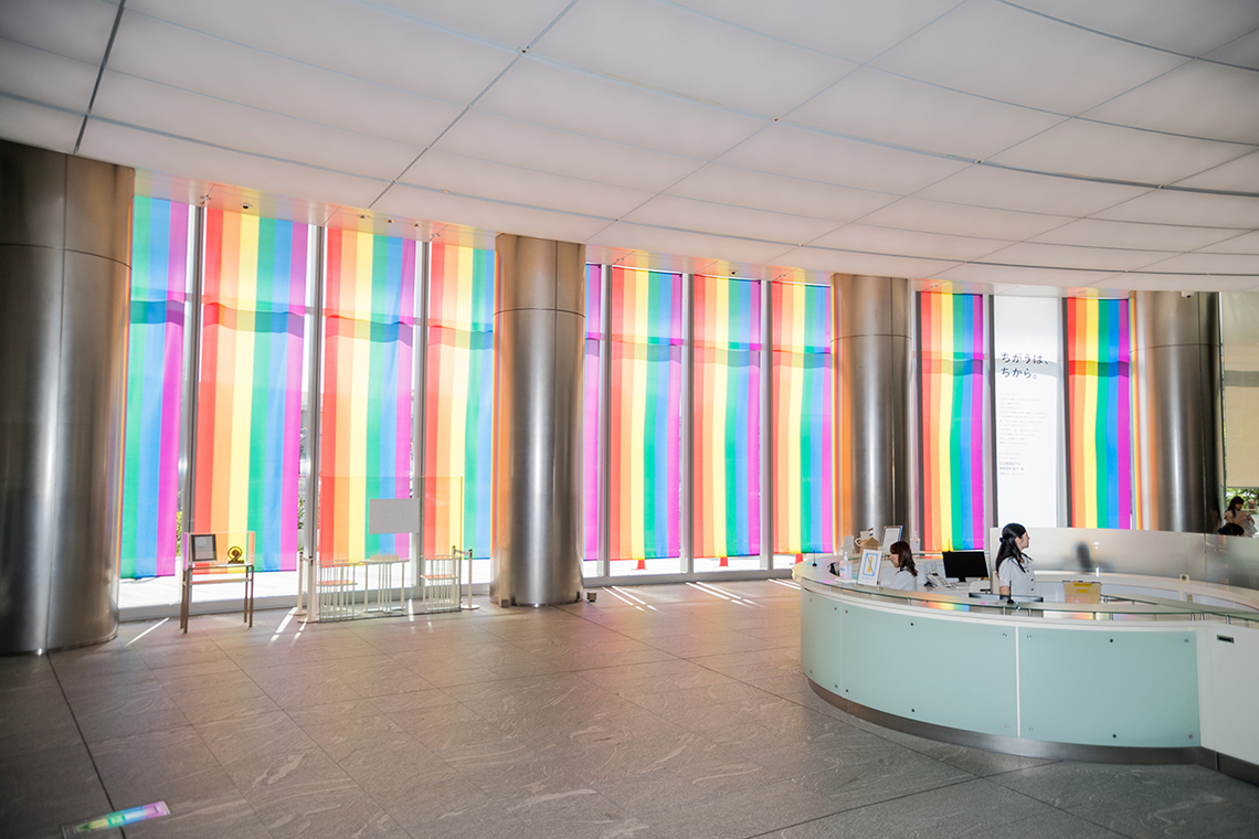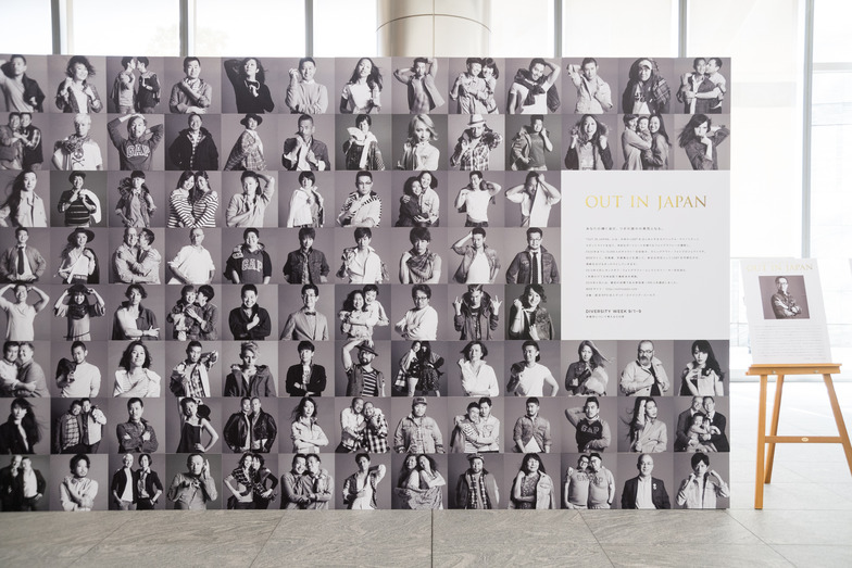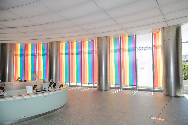電通1階エントランスを、6色の懸垂幕でLGBTのシンボルであるレインボーカラーに。写真家のレスリー・キー氏が撮った「OUT IN JAPAN」プロジェクトのさまざまな家族や、カップル、個人などの写真を展示している。