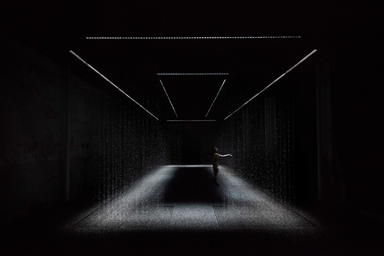 建築家の田根剛さんとやったんですが、LEDの特徴の一つに高速応答性があって、信号を送るとすぐそれに反応する。それまでの光源はオン・オフとか調光とかすると、寿命にダイレクトに影響があったけど、LEDにはそれがない。その価値を魅力に変えたくて、ただ筋状に滝みたいに落ちている水に高速点滅するLEDの光を当てると、すごく小さな火花が空中に舞っているように見える。火花が明滅しているような見え方になるんです。