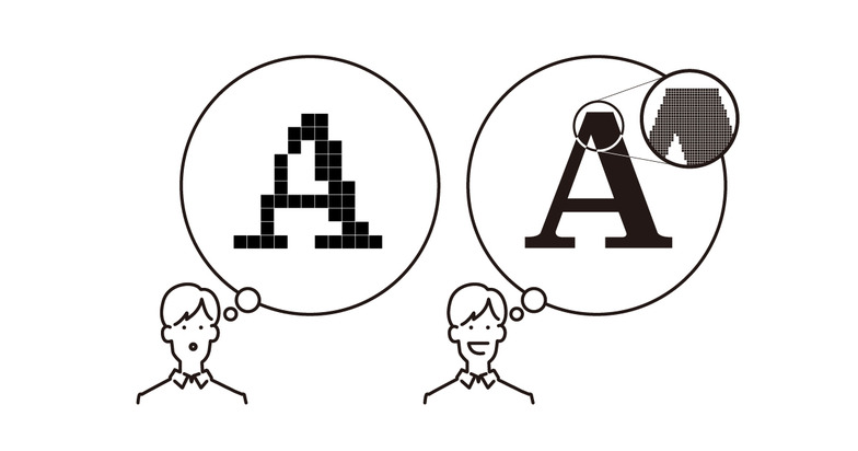 解像度を図解すると上のようになります。左が解像度の低い状態であり、右が解像度の高い状態です。同じAが表記されていることに変わりありませんが、解像度が低いと文字がガタガタとしており、かろうじてAという文字を認識できるレベルです。その一方、解像度が高ければ、Aの文字の形状は鮮明になり、誰がどう見ても、Aと答えられるものになります。