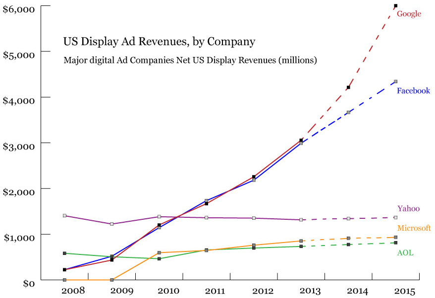 2007年のダブルクリック買収以来、グーグルはディスプレー広告に投資を集中してきた。10年にグーグルはフェイスブックと共にヤフーを追い抜き、現在はフェイスブックとほぼ同じ水準。今後もグーグルは急伸を続け、15年には60億ドルに迫り、フェイスブックの40億ドルを大きく引き離すと予想されている。ヤフー、マイクロソフト、AOLは横ばいの見込みだ。