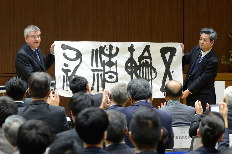式典の終わりに、バッハ会長は書道に挑戦。「五輪精神」の最後の一筆を入れて書を完成させ、聴衆から大きな拍手を受けた。