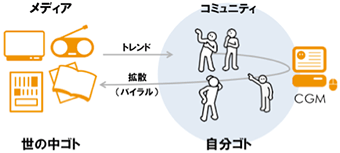 特に、メディアから発信されるニュースがCGMで議論されて拡散(バイラル)を起こしたり、CGM内で盛り上がったコンテンツが全国的にファンを生み、文化として定着したりするようになりました。「世の中ゴト」として発信されるトレンドは親しい身内、すなわちコミュニティで咀嚼され、「自分ゴト」として共有されるようになり、メディアや広告は一方的に情報を提供するだけでなく、どのようにしてコミュニティと親しくなり、情報を自分ゴト化してもらうか、という点に意識を向けることが、消費者とのよりよい関係づくりに必要になってきました。