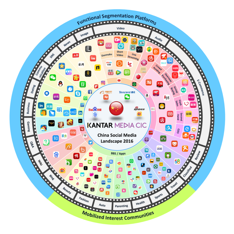 2016年に中国のソーシャルビジネスコンサルティング会社Kantar Media CICによって発表された「2016年中国ソーシャルメディアランドスケープ」では、中国のGoogle的役割を果たす「百度(バイドゥ)」、中国最大のEコマースサイト「Tモール」やペイメント事業を展開する「アリババ」、中国最大のオンライン通信サービスWeChatを提供している「テンセント」、2.82億人(2016年第二季度財務報告から)のユーザーが利用する中国版TwitterであるWeiboを提供している「新浪(シナ)」を中心に、ありとあらゆるソーシャルメディアがその周りに広がっています。