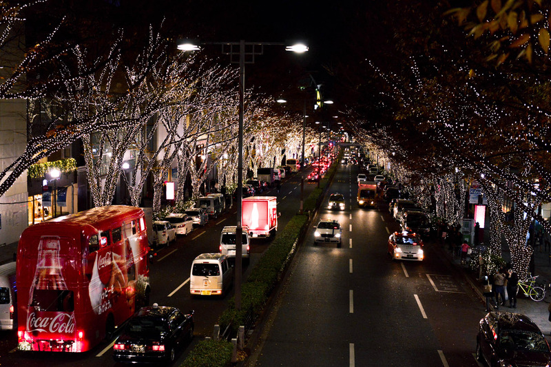 表参道沿いの街路樹には、夜空の月を眺めるポーラーベアをデザインしたフラッグや、冬の「あげるよろこび」をシルエットで表現した30本の円柱形あんどん広告が掲出されている。また、原宿・表参道の公式ガイドブック『ナビゲーター』では、コカ・コーラや、コカ・コーラを使用したさまざまなカクテルを提供する店舗を紹介。さらに、ケヤキ並木に面した東急プラザ表参道原宿3階「おもはらテラス」を「Happy Lounge by Coca-Cola」とし、12月25日までの期間限定で開設している。