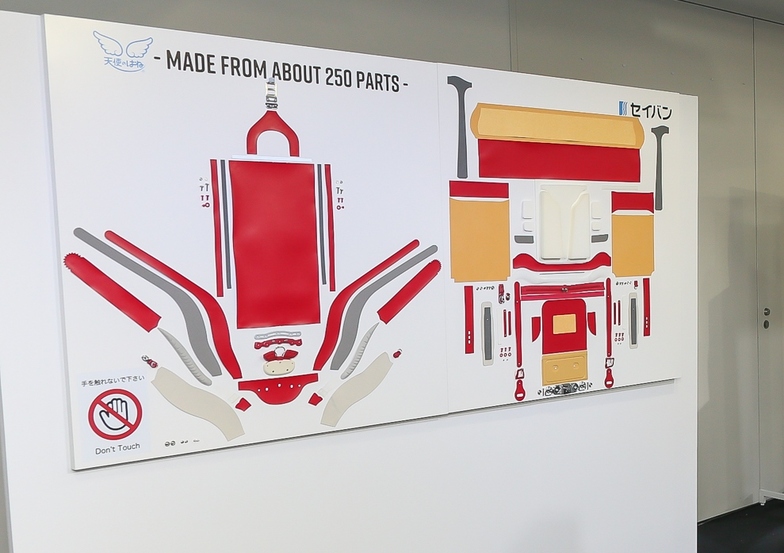 会場には約250 個のパーツが使用されている「天使のはね」ランドセルの解体モデルや2018 年度の新製品も展示された。