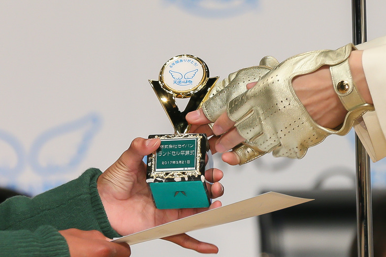 卒業式では、「天使のはね」CMキャラクターのDAIGO さんが立会人を務め、今春小学校を卒業する10人の児童から、6年間使用したランドセルを受け取り、卒業証書と記念のトロフィーを手渡した。子どもたちは、DAIGOさんのインタビューに「初めてランドセルを背負い、ワクワクしながら学校へ行ったことを覚えています」など、楽しかった学校生活を振り返った。