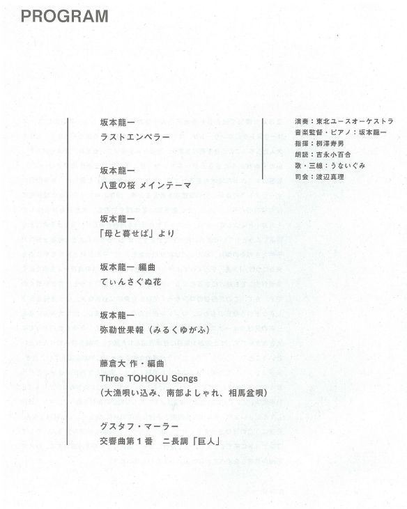 坂本さんは選曲について、「有名な曲だけでなく、東北地方にちなんだ曲も選んだ。また、あえて沖縄の方たちに手伝ってもらうことで、日本古来の水脈のようなものを感じてもらいたかった」と語り、震災について「時間がたっても、忘れないという気持ちで続けていきたい」と話した。