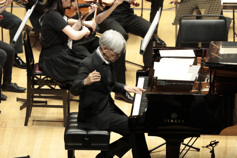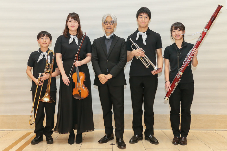 世界的な音楽家の坂本龍一さんは「子どもの音楽再生基金」の発起人として、被災楽器の点検修理をはじめ、現地の学校に対し幅広い音楽支援活動を行うとともに、同オーケストラをプロデュース。演奏会を行うのは2016年に続き2回目となる。直前合宿にも代表・音楽監督として参加した坂本さんは「子どもたちも、支える大人たちも、この活動を続ける意味、意義を考え続けていますが、実は子どもたちに教えられることがいちばん多い」と話す。オープニング曲の「ラストエンペラー」と「八重の桜 メインテーマ」では、104人のオーケストラと共に坂本さんもピアノで演奏に加わった。坂本さんは「年月がたつのは早い。練習を始めてから足かけ3年、小学4年生は6年生になり音が力強くなってきた」と、結成当時を振り返りながら、子どもたちの成長に感慨深げだった。
